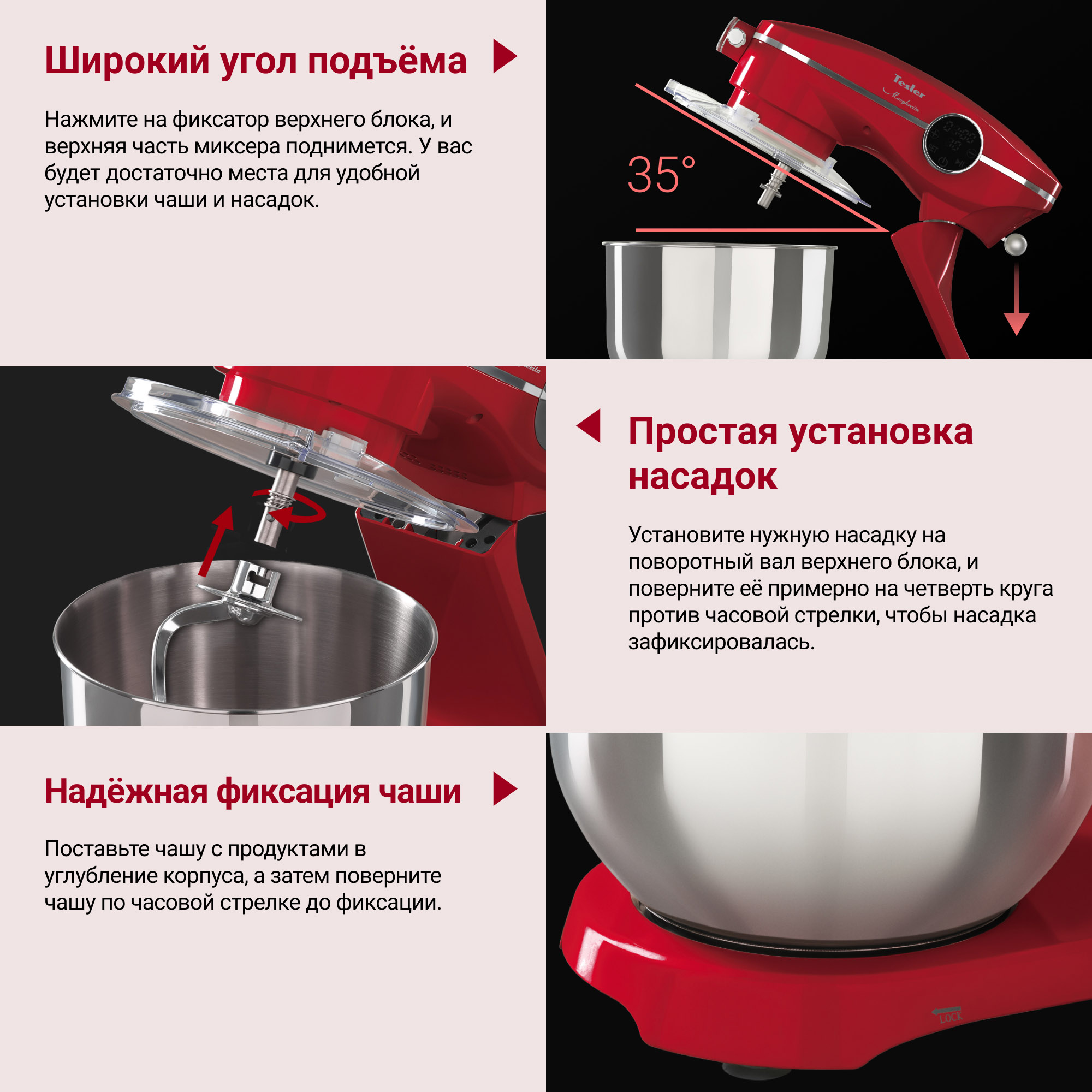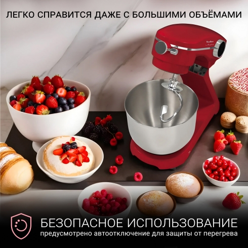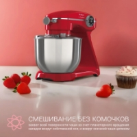 С помощью идущих комплекте аксессуаров вы сможете быстро и эффективно соединять различные ингредиенты. Крюк для замешивания предназначен для приготовления густого теста для пирогов, хлеба и другой выпечки. Насадка для перемешивания подойдёт для смесей средней вязкости, таких как овощные пюре и соусы. Венчик будет полезен для взбивания яиц, сливок, кремов, чтобы придать им воздушность и объем. Конструкция планетарного миксера позволяет взбить венчиком даже 1 яйцо, чтобы приготовить небольшую порцию. Все насадки изготовлены из прочной нержавеющей стали.