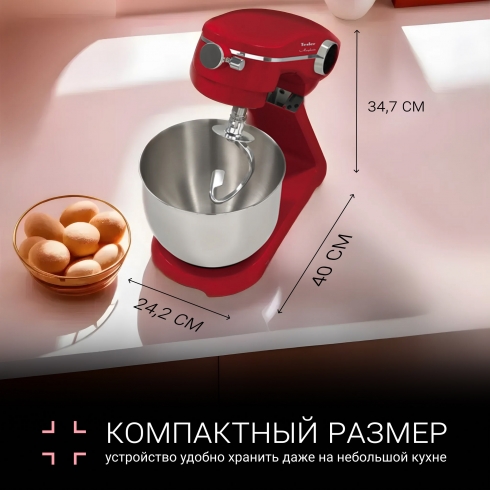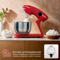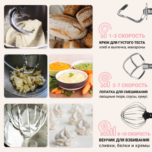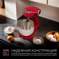 С помощью идущих комплекте аксессуаров вы сможете быстро и эффективно соединять различные ингредиенты. Крюк для замешивания предназначен для приготовления густого теста для пирогов, хлеба и другой выпечки. Насадка для перемешивания подойдёт для смесей средней вязкости, таких как овощные пюре и соусы. Венчик будет полезен для взбивания яиц, сливок, кремов, чтобы придать им воздушность и объем. Конструкция планетарного миксера позволяет взбить венчиком даже 1 яйцо, чтобы приготовить небольшую порцию. Все насадки изготовлены из прочной нержавеющей стали.
