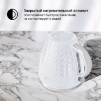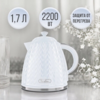 Объём чайника — 1,7 литра, что позволяет приготовить до 7 горячих напитков за один цикл кипячения. 2200 Вт мощности обеспечивают быстрое закипание воды, благодаря чему существенно экономится время.