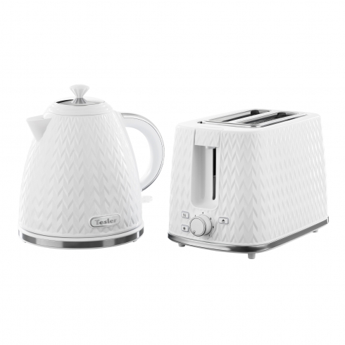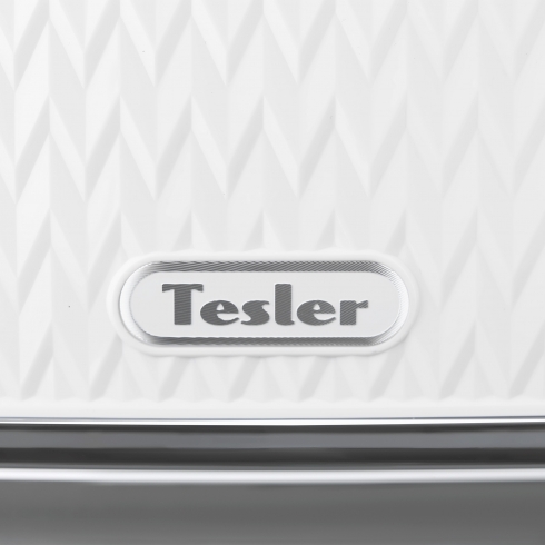 В комплект кухонной техники Tesler CRYSTAL в белом цвете входят чайник, тостер и микроволновая печь.