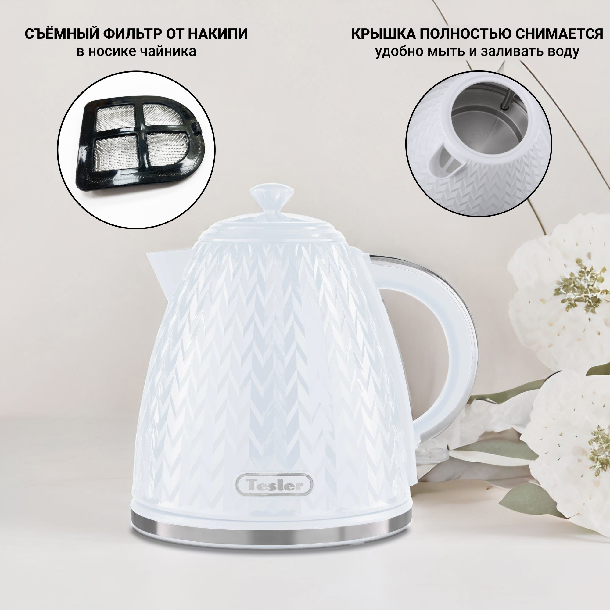 Носик удобной формы защищает от проливания кипятка, в его основании находится съёмный фильтр от накипи.