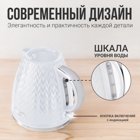 Объём чайника — 1,7 литра, что позволяет приготовить до 7 горячих напитков за один цикл кипячения. 2200 Вт мощности обеспечивают быстрое закипание воды, благодаря чему существенно экономится время.