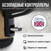 Большое внимание при разработке было уделено надежности и безопасности. Чайники TESLER серии Gloria оснащены английскими контроллерами Strix. Это означает 100% гарантию качества и безопасное длительное использование до 15000 рабочих циклов. Модель имеет трёхуровневую систему защиты, которая отключает устройство в случае закипания, отсутствия воды, а также при снятии электрочайника с рабочей станции.