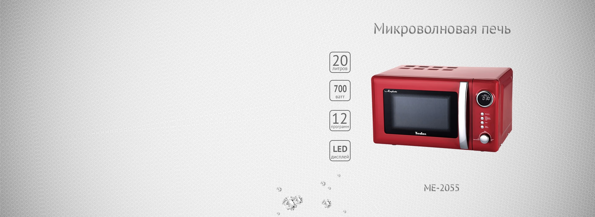 Микроволновая СВЧ-печь Tesler Margherita ME-2055 - бестселлер на вашей кухне! Свежий и современный дизайн особо подчеркивают выразительные цвета, в которых доступна вся линейка Margherita: красный, бежевый, черный, голубой. Корпус выполнен из окрашеной нержавеющей стали и высококачественного приятного на ощупь пластика. LED экран, органы управления и ручка дверцы микроволновой печи ME-2055 отделаны хромированными вставками, которые придают внешнему виду СВЧ-печи Tesler Margherita особый утонченный облик и капельку шарма. Небольшой размер позволит легко вписать эту микроволновую печь даже в самые компактные пространства кухни. Поверхность камеры печи со специальным покрытием Easy Clean препятствует налипанию пищи и образованию жировой пленки, легко моется и помогает поддерживать пространство внутренней камеры в чистоте.