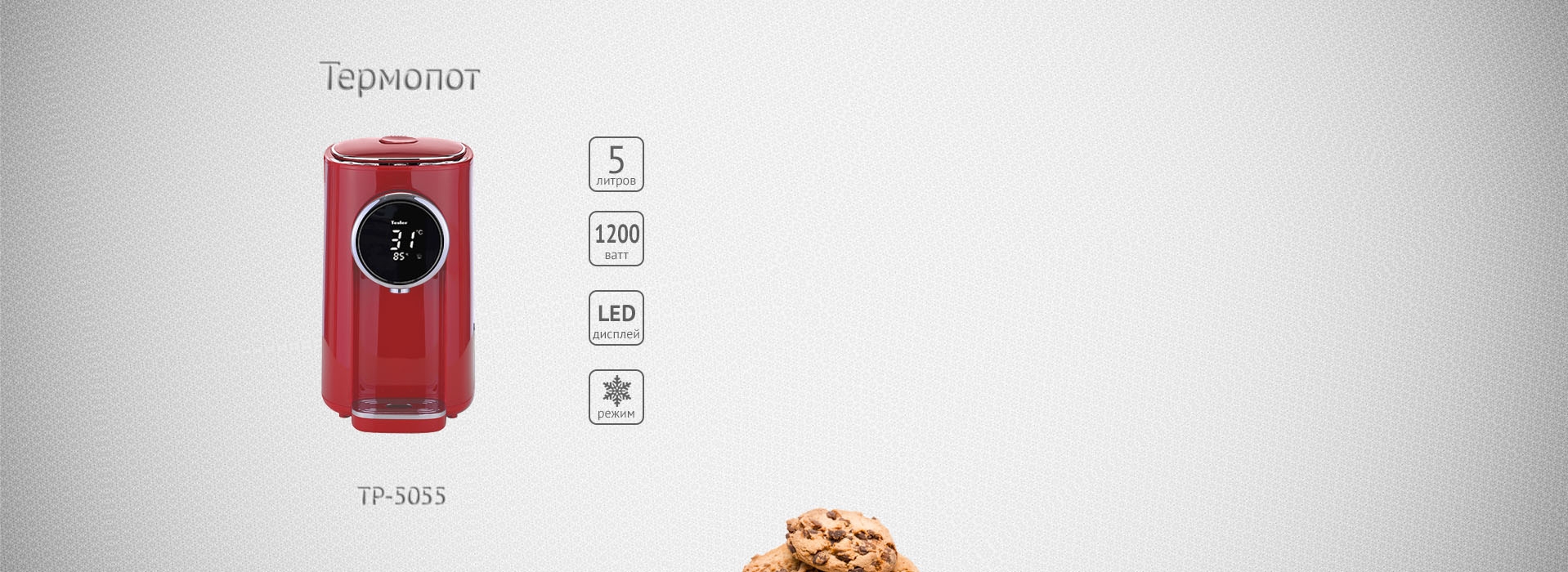 Создать уют и комфортные условия на кухне поможет устройство, сочетающее в себе функции чайника, кулера и диспенсера для воды - термопот. Имея достаточный объем запаса воды - 5 литров, термопот Tesler Margherita TP-5055 может служить в качестве устройства для кипячения и подогрева воды, поддержания температуры и даже охлаждения жидкости. Информативный светодиодный LED дисплей выполнен на черном матовом фоне, окантованом хромированной круглой накладкой, отображает текущую и заданную температуру воды и рабочий режим. Цвет дисплея белый - мягкий и теплый, отлично сочетается с любый цветом, доступным в линейке Tesler Margherita.