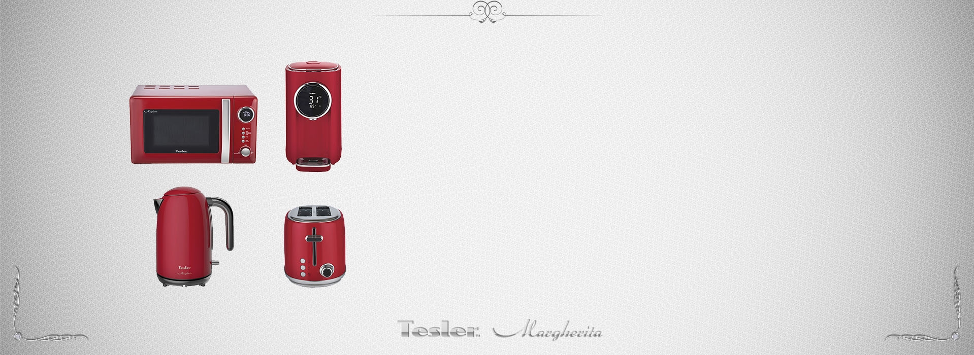 Модель выпускается в нескольких цветах. В комплект кухонной техники Tesler Margherita входят 4 устройства: СВЧ-печь, чайник, тостер и термопот.