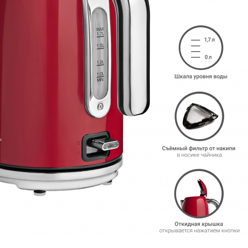 Английская надежность, приправленная высокой мощностью под соусом безупречного стиля - это и есть рецепт Tesler Margherita KT-1755. Выполнен из высококачественной нержавеющей стали, выкрашенной в один из цветов: красный, бежевый, черный, голубой. Большая мощность 2000 Ватт позволяет быстро вскипятить объем воды до 1.7 литра. Чайник оснащен контроллером Strix (Великобритания), который производит автоматическое отключение нагревательного элемента в одном из трех случаев: при закипании или отсутствии воды и при снятии чайника с рабочей станции.