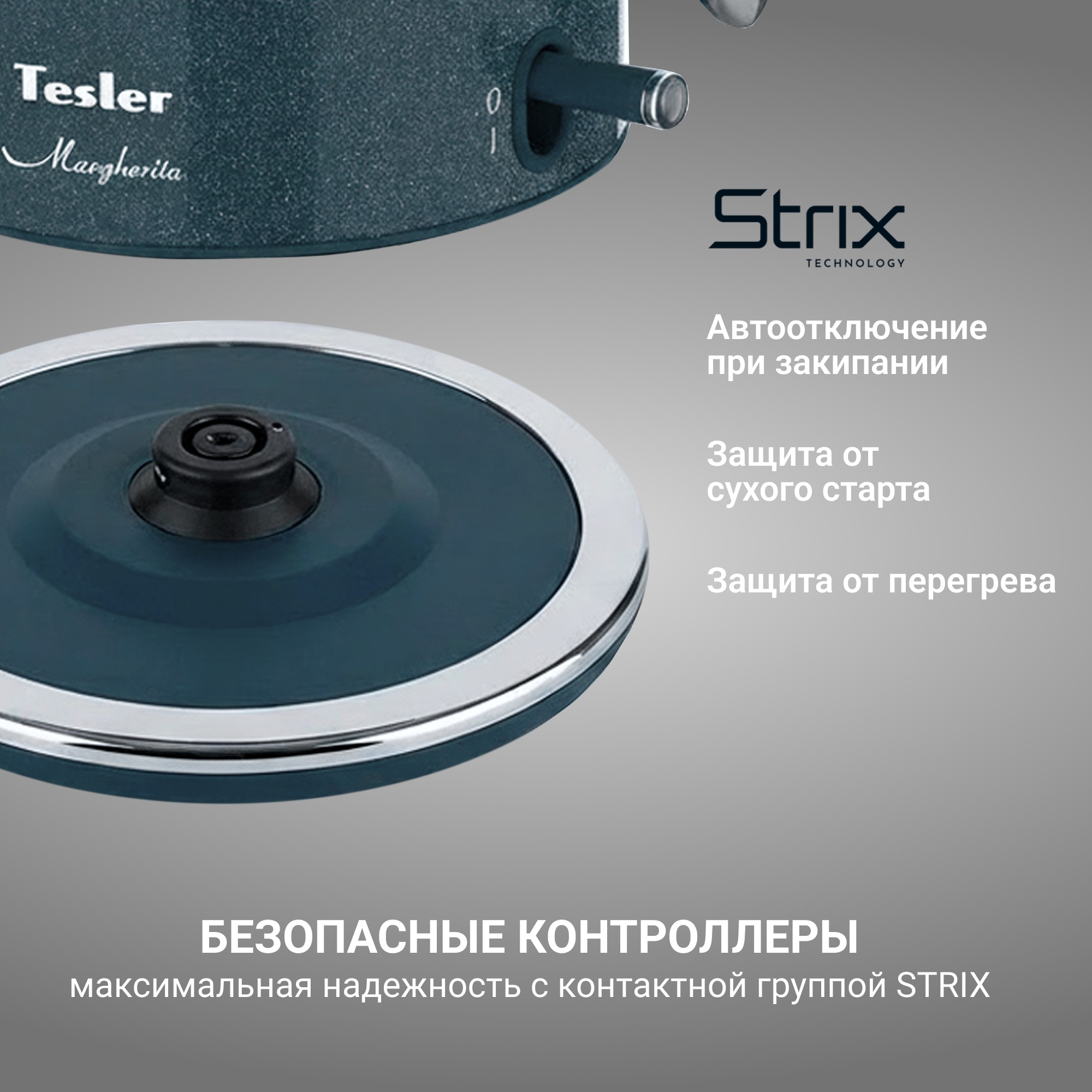 Мощность 2200 Вт позволяет быстро вскипятить полный объём воды. Встроенный английский контроллер STRIX отвечает за стабильную работу: чайник автоматически отключается при закипании, защите от сухого старта и при снятии с базы.