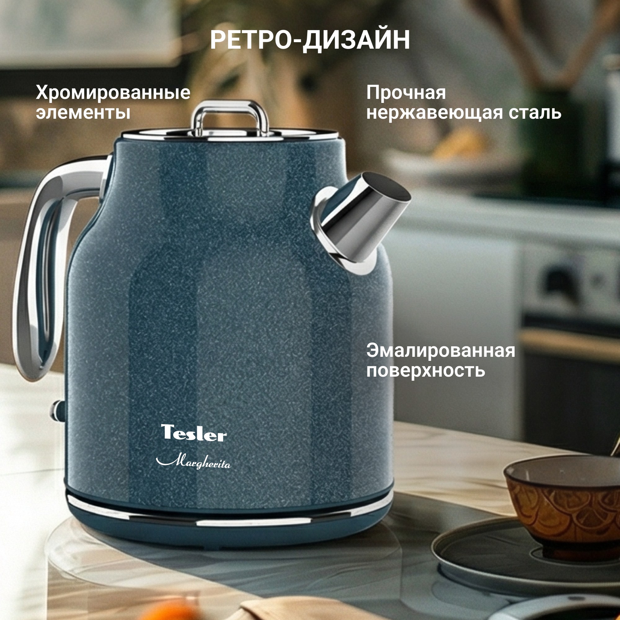 Электрический чайник Tesler Margherita KT-1756 — техника, в которой современный минимализм сочетается с мягкими ретро-линиями. Лаконичная форма, хромированные детали и приглушенные гармоничные оттенки делают модель выразительным акцентом кухни, а продуманная конструкция отвечает за уверенное и безопасное использование.
