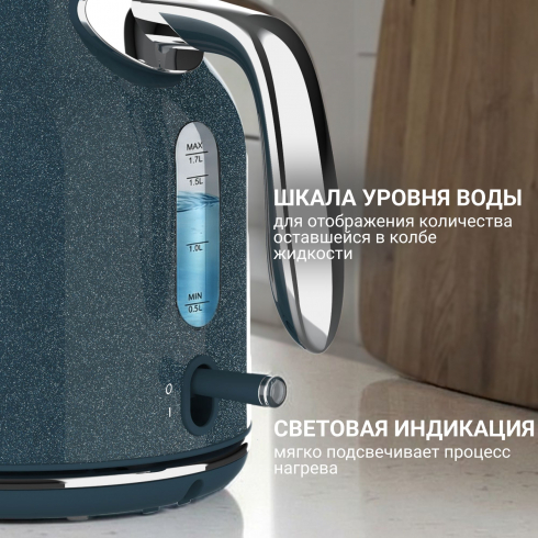 База с возможностью кругового вращения на 360° упрощает установку и подходит для правшей и левшей. Световая индикация мягко подсвечивает процесс нагрева. В носике расположен фильтр, который задерживает частицы накипи и сохраняет чистоту напитка. Внутренняя колба легко очищается — материал устойчив к появлению запахов и хорошо переносит регулярное использование.