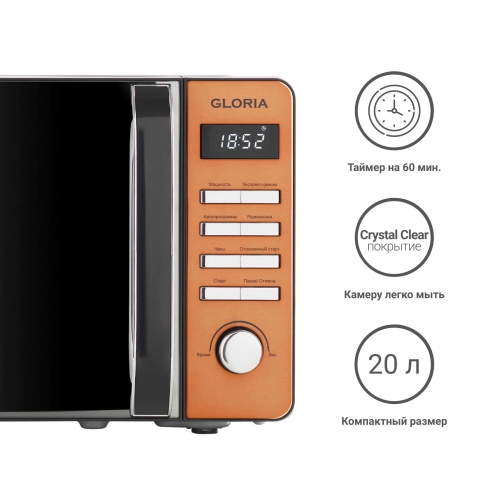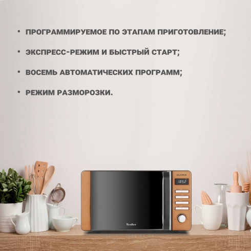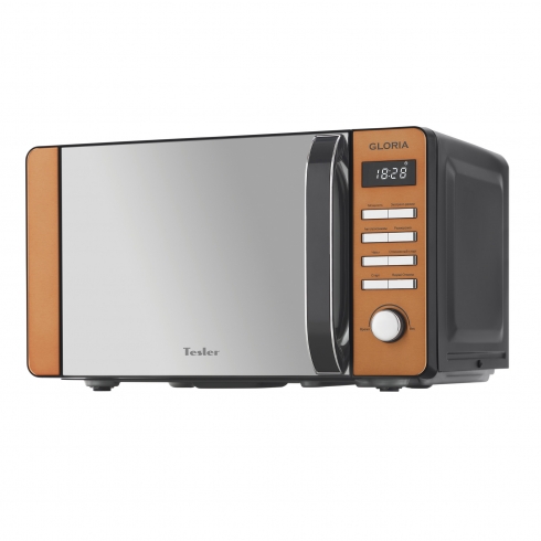 Микроволновая печь Tesler ME-2010 — прекрасное украшение интерьера благодаря панели из нержавеющей стали с медным декором и дверцей из закалённого стекла с зеркальным напылением. Благодаря покрытию камеры Crystal Clear избавиться от загрязнений внутри СВЧ-печи стало еще проще!