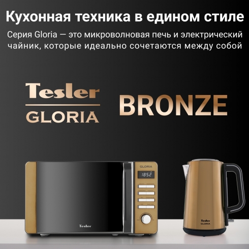 В комплект кухонной техники Tesler Gloria в бронзовом цвете также входит электрический чайник KT-1710 BRONZE ёмкостью 1,7 л. Оба прибора идеально сочетаются между собой, и добавят яркого тепла вашему кухонному интерьеру.