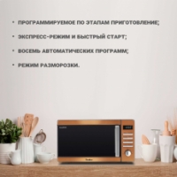 Модель имеет 8 автоматических режимов, а также дополнительные функции, от размораживания и разогрева до отложенного старта. С помощью экспресс-режима удобно разогревать воду или напитки, минуя этап установки мощности – просто установите время приготовления в зависимости от объема напитка.