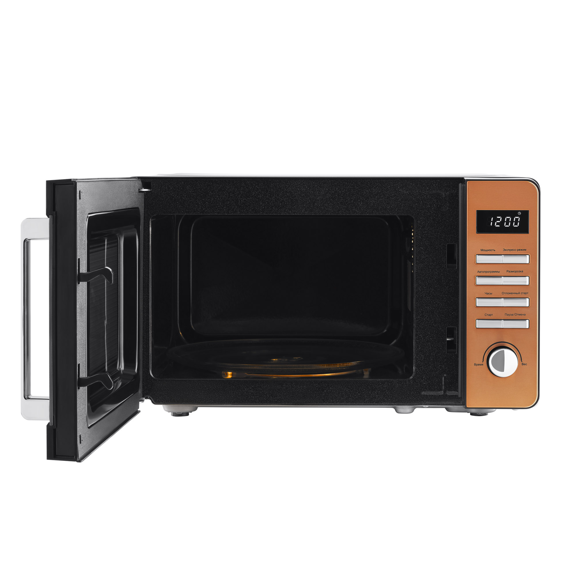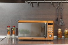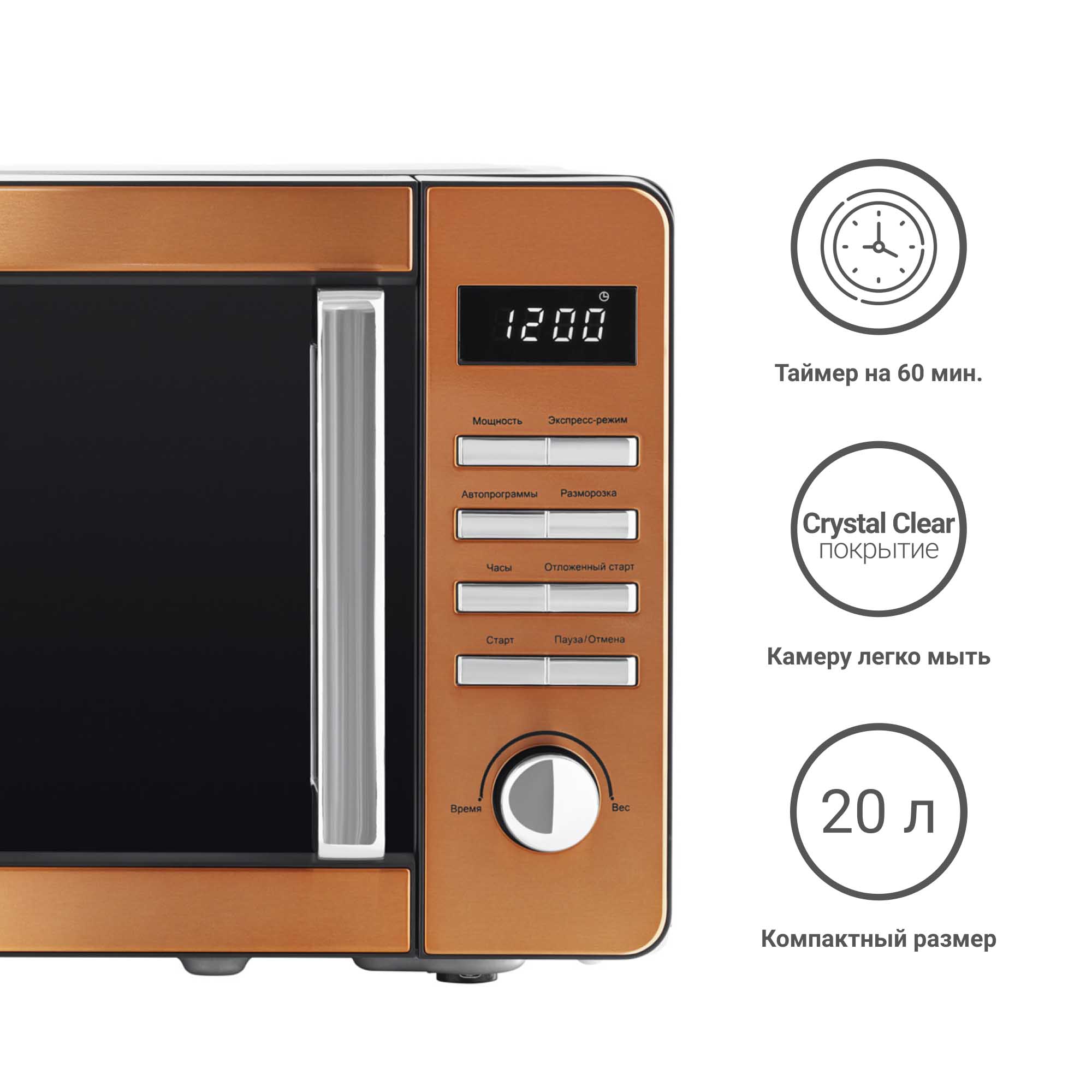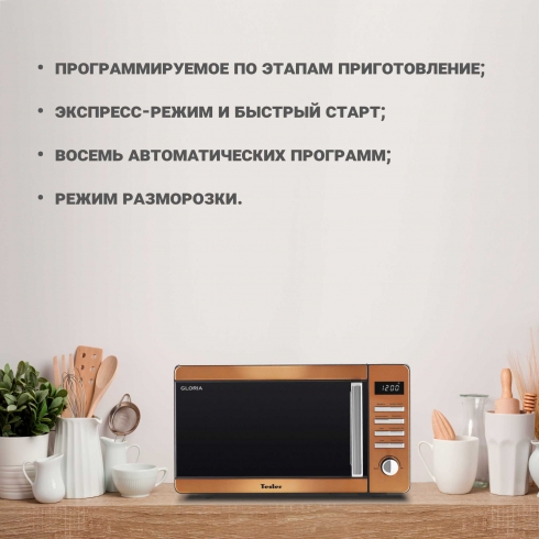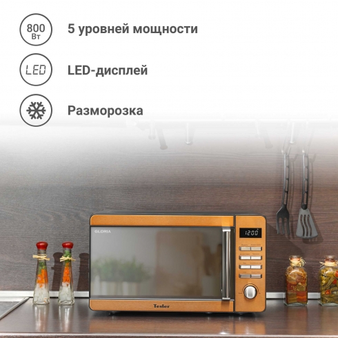 Микроволновая печь Tesler ME-2015 — прекрасное украшение интерьера благодаря панели из нержавеющей стали с медным декором и дверцей из закалённого стекла с зеркальным напылением. Благодаря покрытию камеры Crystal Clear избавиться от загрязнений внутри СВЧ-печи стало еще проще!