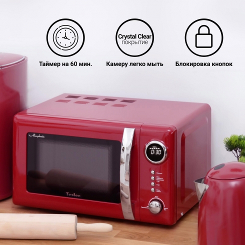 Микроволновая СВЧ-печь Tesler Margherita ME-2055 - бестселлер на вашей кухне! Свежий и современный дизайн особо подчеркивают выразительные цвета, в которых доступна вся линейка Margherita: красный, бежевый, черный, голубой. Корпус выполнен из окрашеной нержавеющей стали и высококачественного приятного на ощупь пластика. LED экран, органы управления и ручка дверцы микроволновой печи ME-2055 отделаны хромированными вставками, которые придают внешнему виду СВЧ-печи Tesler Margherita особый утонченный облик и капельку шарма. Небольшой размер позволит легко вписать эту микроволновую печь даже в самые компактные пространства кухни. Поверхность камеры печи со специальным покрытием Easy Clean препятствует налипанию пищи и образованию жировой пленки, легко моется и помогает поддерживать пространство внутренней камеры в чистоте.