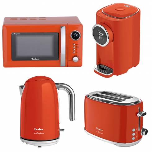 • В комплект кухонной техники Tesler Margherita входят 4 устройства: СВЧ-печь, чайник, тостер и термопот.