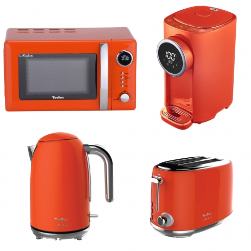 В комплект кухонной техники Tesler Margherita входят 4 устройства: СВЧ-печь, чайник, тостер и термопот.