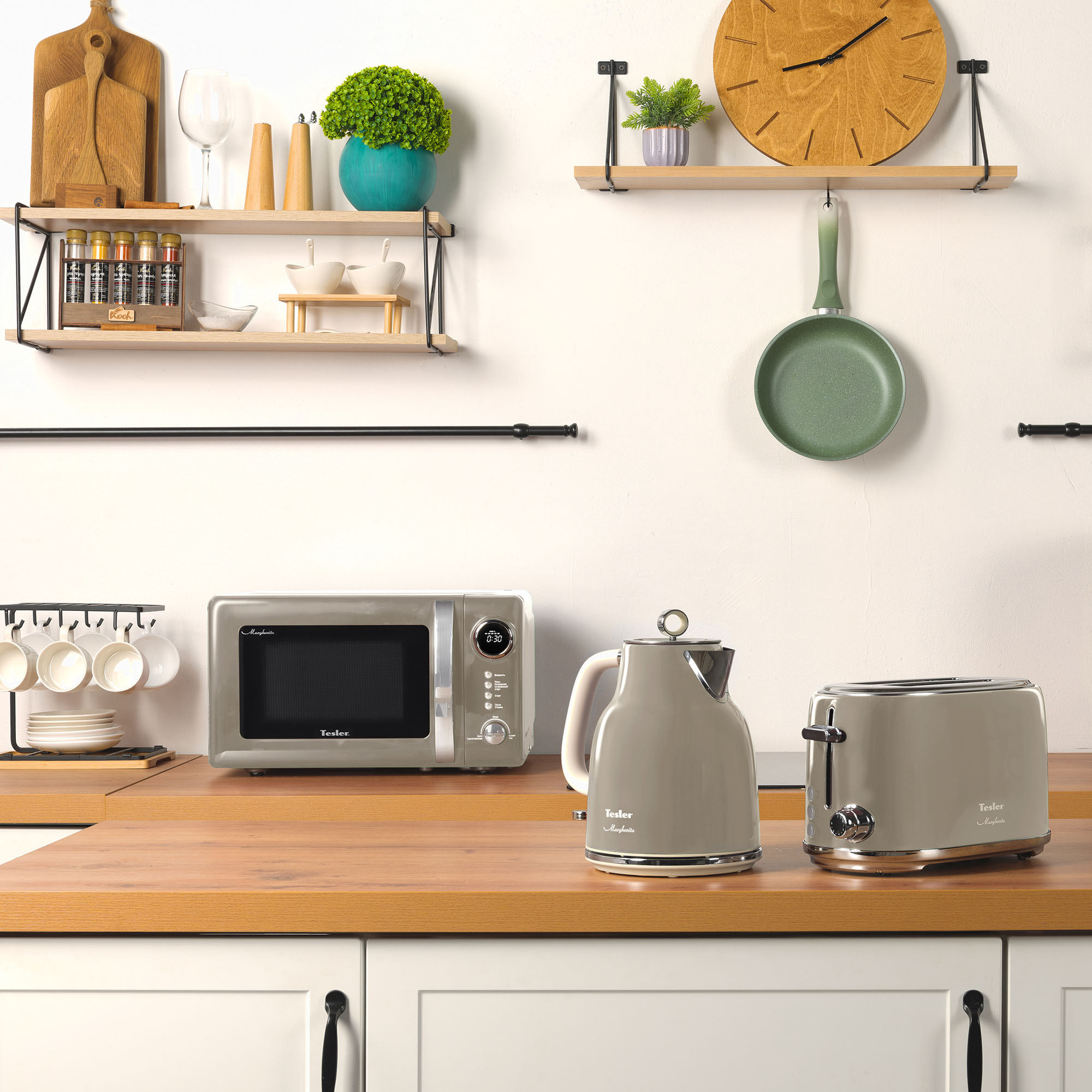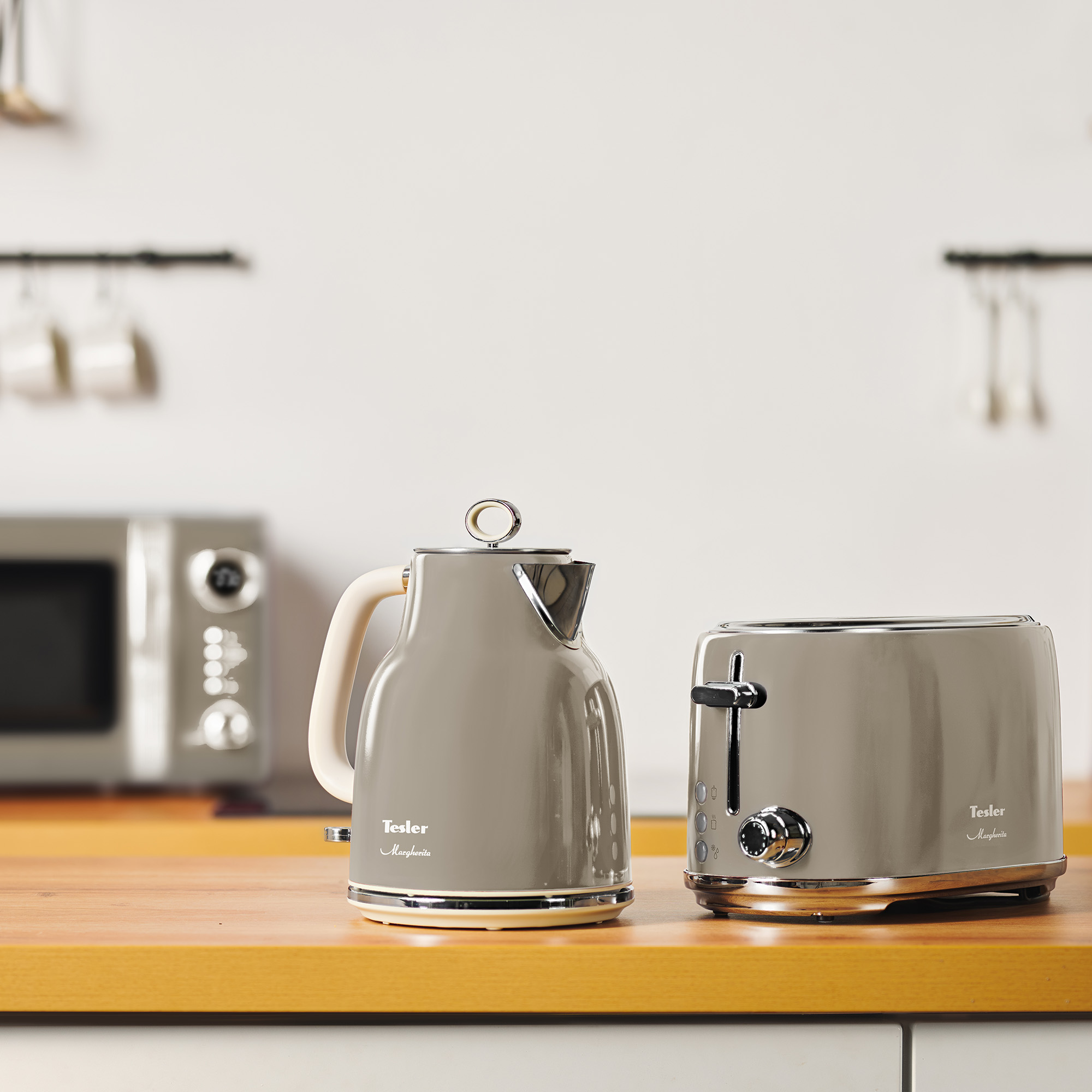 В комплект кухонной техники Tesler Margherita SAND GREY входят СВЧ-печь, чайник и тостер.