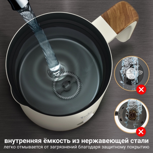 На внутреннюю ёмкость из нержавеющей стали нанесено покрытие для лёгкой очистки, поэтому после каждого использования вы можете просто промыть её водой с средством для мытья посуды. Не допускайте попадания капель или брызг воды в область кнопок включения и контактных пазов на дне вспенивателя. Насадки и крышку можно помыть под струей воды.