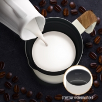 Объем ёмкости капучинатора составляет 240 мл, что идеально подходит для создания молочной пены на одну или две порции кофе. Внутри нанесена разметка, показывающая максимальный и минимальный объём жидкости для разных режимов. Корпус прибора выполнен из нержавеющей стали.