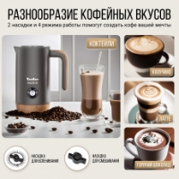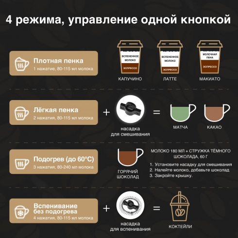 поможет приготовить классический капучино, латте или макиато всего за пару минут без лишних хлопот! Этот компактный и мощный прибор предлагает 4 различных режима работы: Плотная пенка, Легкая пенка, Подогрев и Вспенивание без подогрева, позволяя вам получить именно ту текстуру и температуру пены, которая вам нужна.