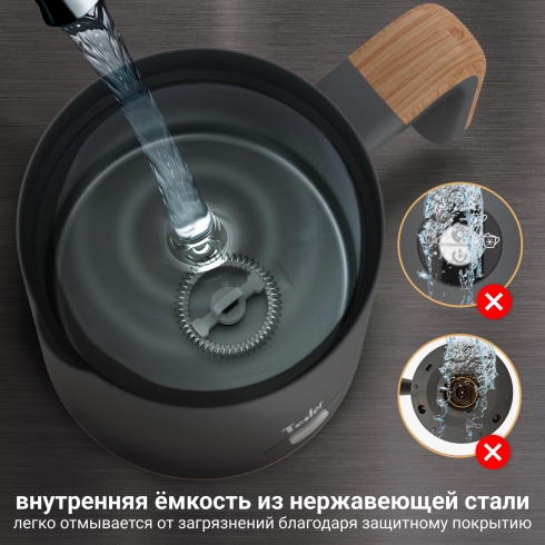 На внутреннюю ёмкость из нержавеющей стали нанесено покрытие для лёгкой очистки, поэтому после каждого использования вы можете просто промыть её водой с средством для мытья посуды. Не допускайте попадания капель или брызг воды в область кнопок включения и контактных пазов на дне вспенивателя. Насадки и крышку можно помыть под струей воды.