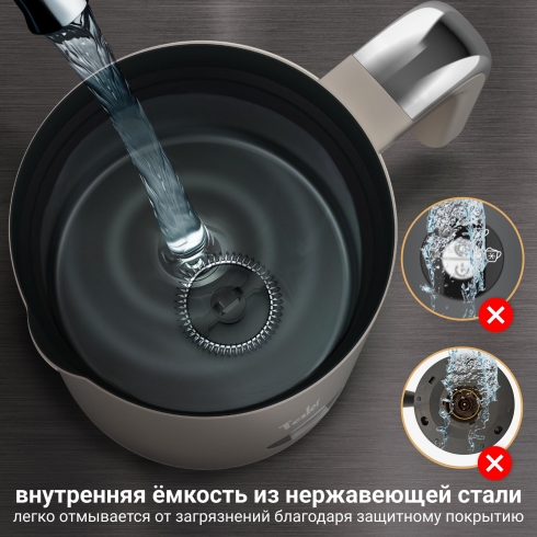На внутреннюю ёмкость из нержавеющей стали нанесено покрытие для лёгкой очистки, поэтому после каждого использования вы можете просто промыть её водой с средством для мытья посуды. Не допускайте попадания капель или брызг воды в область кнопок включения и контактных пазов на дне вспенивателя. Насадки и крышку можно помыть под струей воды.