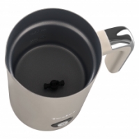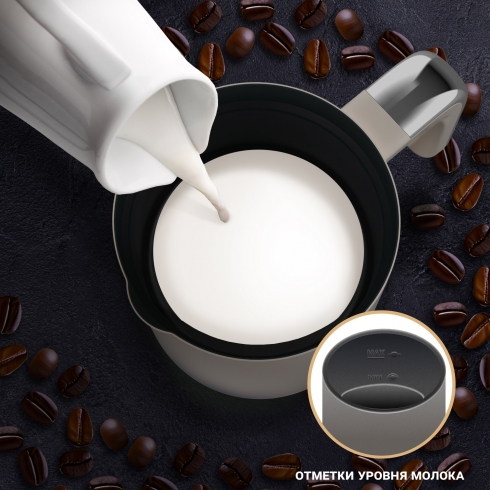 Объем ёмкости капучинатора составляет 240 мл, что идеально подходит для создания молочной пены на одну или две порции кофе. Внутри нанесена разметка, показывающая максимальный и минимальный объём жидкости для разных режимов. Корпус прибора выполнен из нержавеющей стали.
