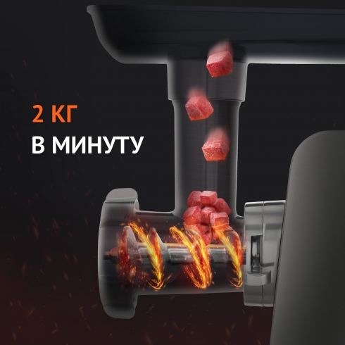 Мощный двигатель обеспечивает высокую производительность прибора, благодаря чему вы можете обработать 2 кг мяса в минуту и сэкономить время. 2 скорости работы позволят использовать оптимальный режим для разных продуктов. Минимальная скорость подходит для отварных продуктов, куриного филе и рыбы, мягких овощей. Чтобы сделать фарш из красного мяса установите максимальную скорость.