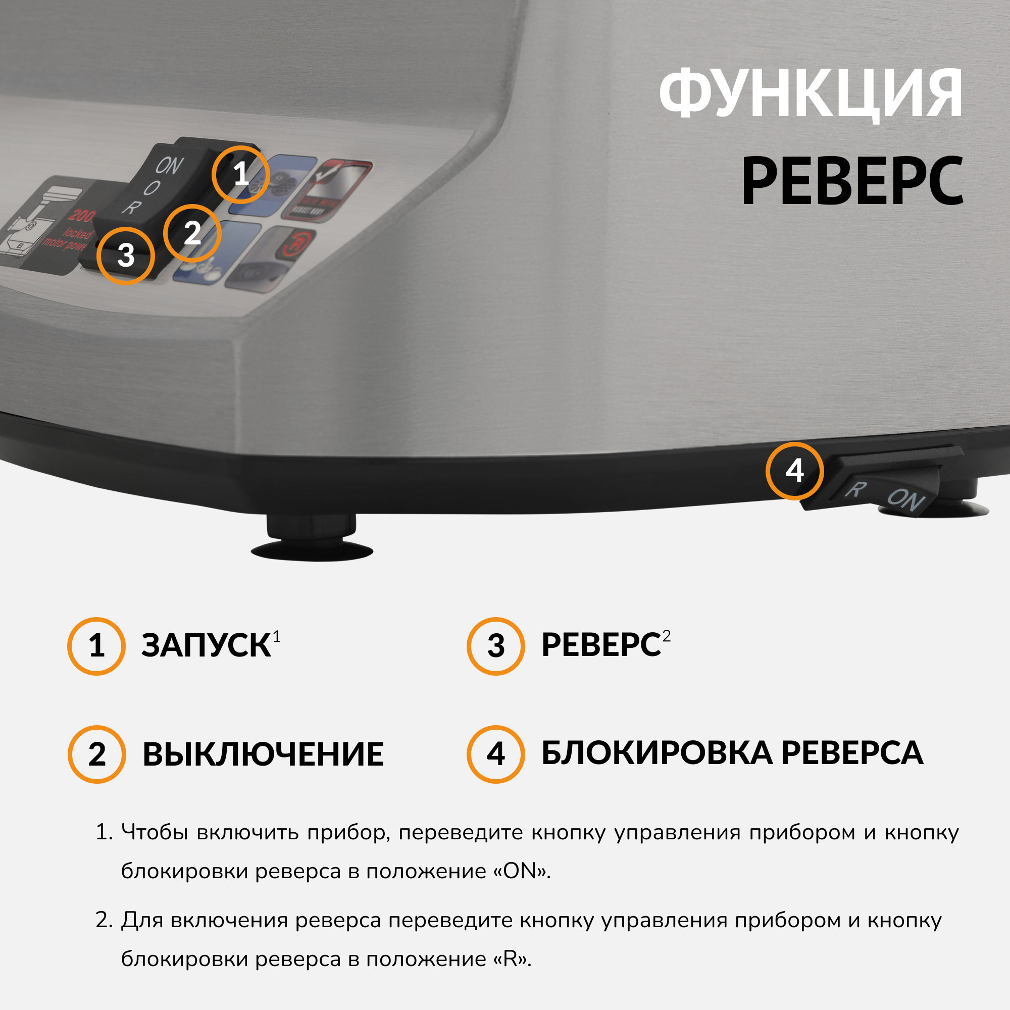 Больше не нужно разбирать мясорубку, чтобы провести очистку рабочего отсека от излишков мяса: функция реверса запустит обратный ход шнека. При этом масса продуктов перераспределится, и прибор будет готов к дальнейшему использованию. Для включения реверса переведите кнопку управления прибором и кнопку блокировки реверса в положение «R».