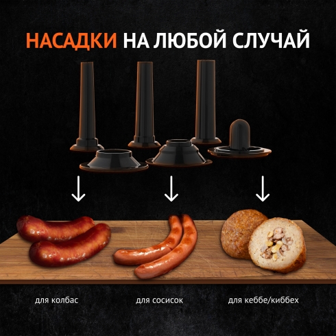 Приготовить сосиски и колбасы не составит труда благодаря трём насадкам разного размера. В комплектацию также входит насадка для кеббе - восточных котлеток с начинкой.