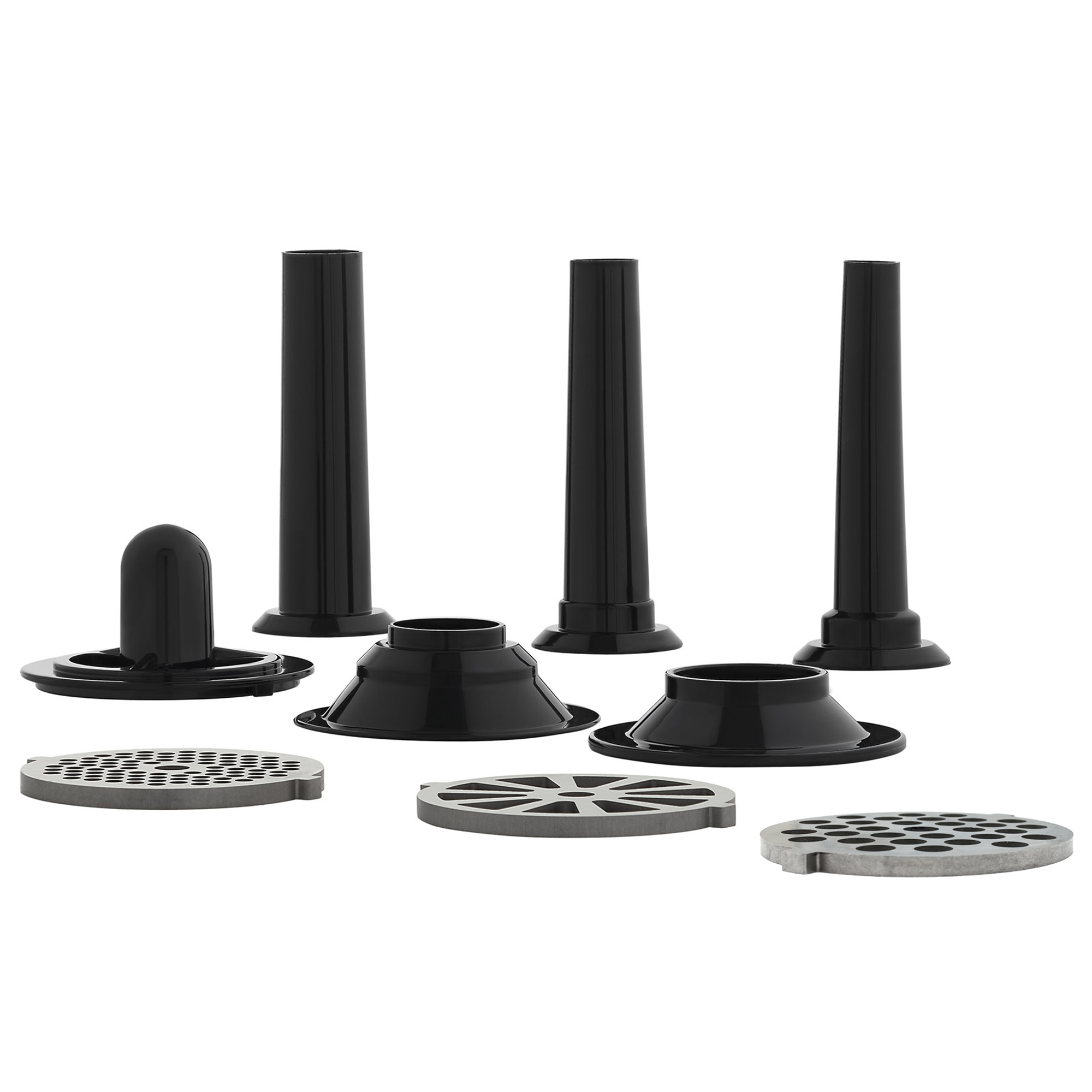 В комплект входят 3 диска для фарша с разным диаметром отверстий. Диск с крупными отверстиями поможет получить крупный помол, который необходим для бифштексов и кебабов. Диск для среднего помола пригодится для запеканок, колбас и фрикаделек. Фарш для нежного суфле и паштетов можно получить, воспользовавшись диском с мелкими отверстиями.