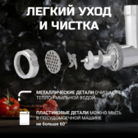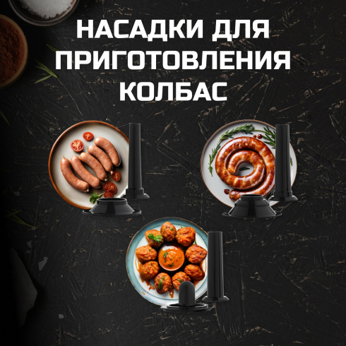 Приготовить сосиски и колбасы не составит труда благодаря трём насадкам разного размера. В комплектацию также входит насадка для кеббе - восточных котлет с начинкой.Удобный механизм фиксации корпуса шнека позволит собрать мясорубку за секунды. Сверхпрочный литой алюминиевый корпус устойчив к царапинам, и дополнен нескользящими ножками, благодаря чему мясорубка устойчиво стоит на столешнице во время работы. Редуктор с металлической силовой шестерней обеспечит долгий срок службы.