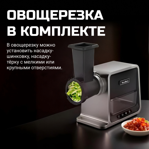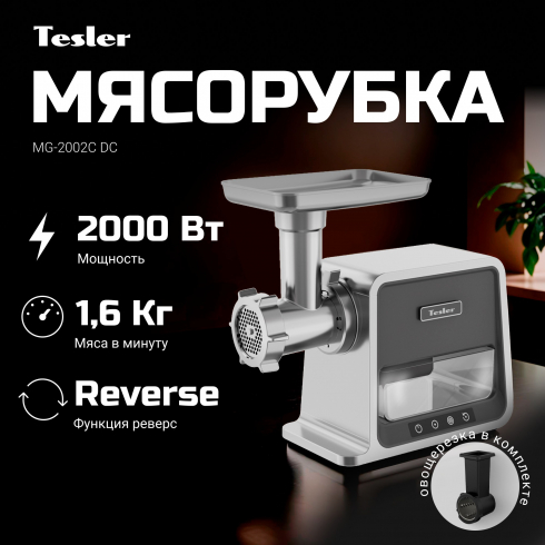 Электрическая мясорубка Tesler MG-2002C DC – это надежный кухонный помощник, обладающий высокой производительностью благодаря современному мотору постоянного тока. Модель поставляется в комплекте с широким набором аксессуаров для приготовления различных блюд, включающим овощерезку, 3 вида решеток и насадки для колбас и кеббе.
