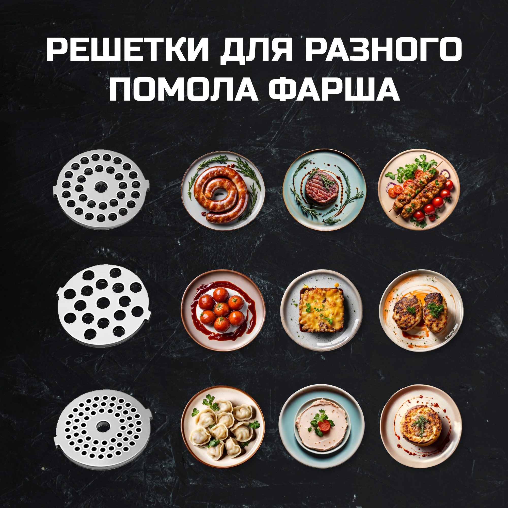 В комплект входят 3 диска для фарша с разным диаметром отверстий. Диск с крупными отверстиями поможет получить крупный помол, который необходим для бифштексов и кебабов. Диск для среднего помола пригодится для запеканок, колбас и фрикаделек. Фарш для нежного суфле и паштетов можно получить, воспользовавшись диском с мелкими отверстиями.