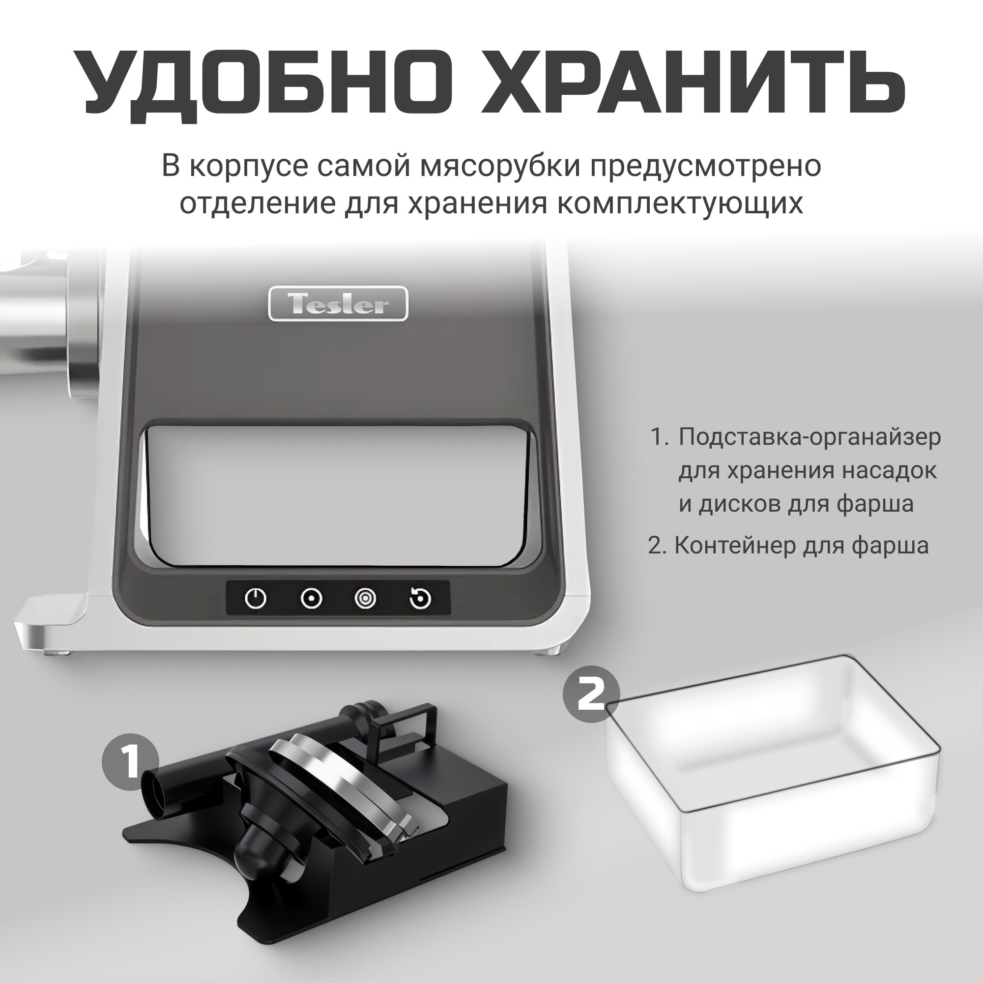 В комплект входит удобная подставка-органайзер для хранения насадок и дисков для фарша.
