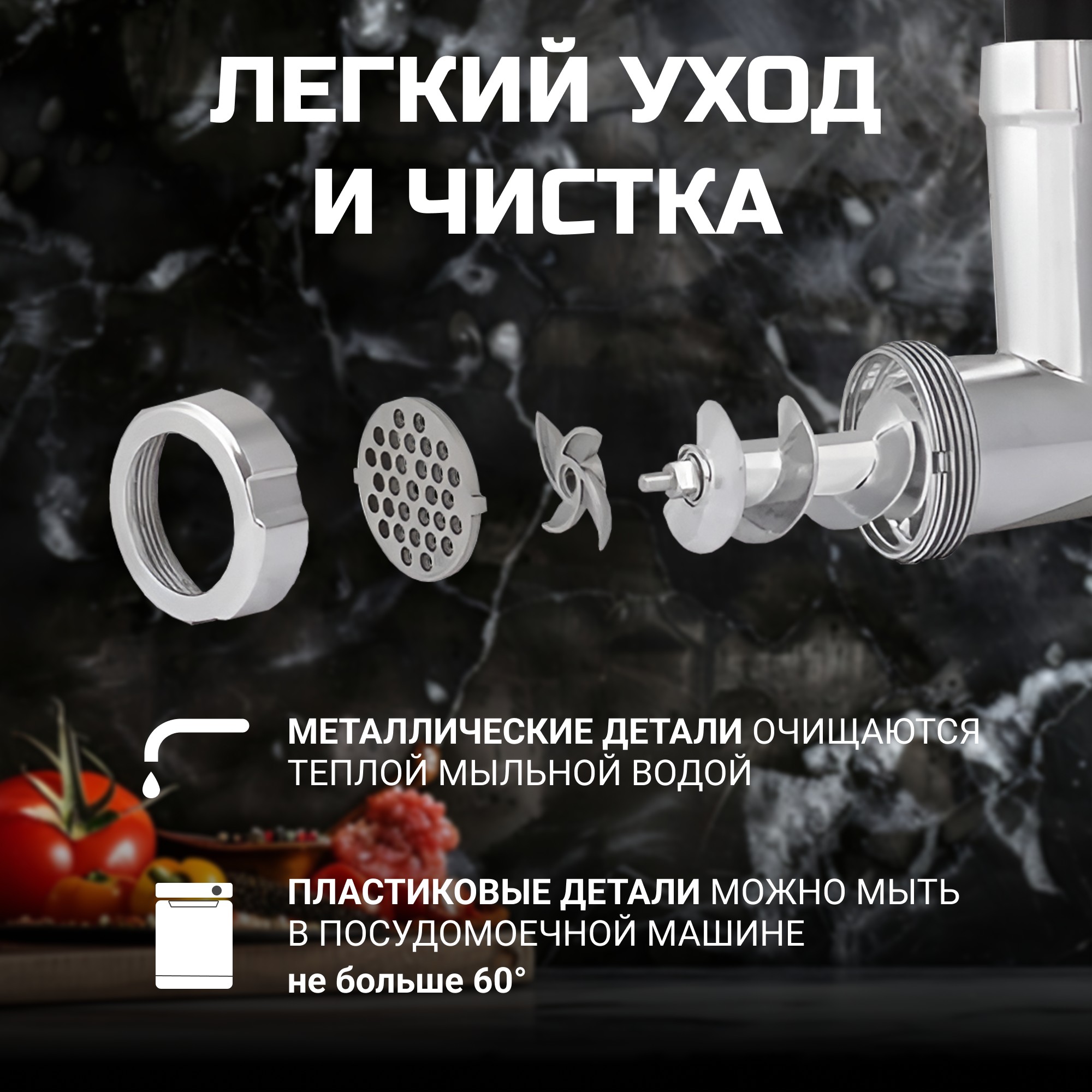 Работа с прибором максимально проста: все управление осуществляется четырьмя кнопками. Все детали, контактирующие с мясом, легко снимаются для очистки.