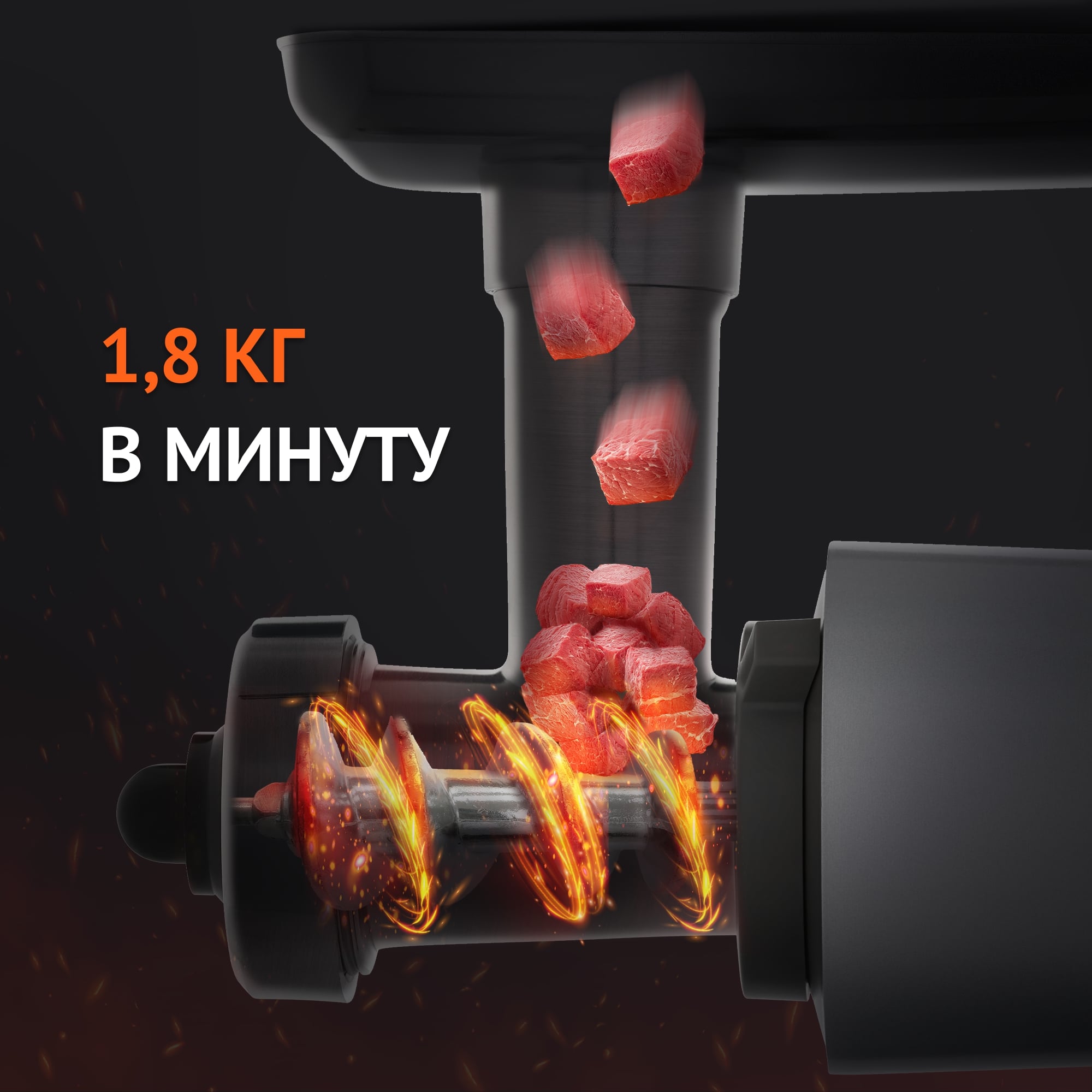 Мощный двигатель постоянного тока справляется даже с повышенными нагрузками, эффективно преодолевая сопротивление жестких, жилистых кусков мяса. Благодаря высокой производительности прибора вы можете обработать до 1,8 кг мяса в минуту, и сэкономить время.