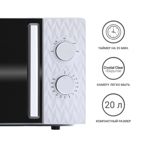 Фактурный дизайн микроволновой печи Tesler CRYSTAL MM-2004 делает ее ярким дополнением любой кухни.