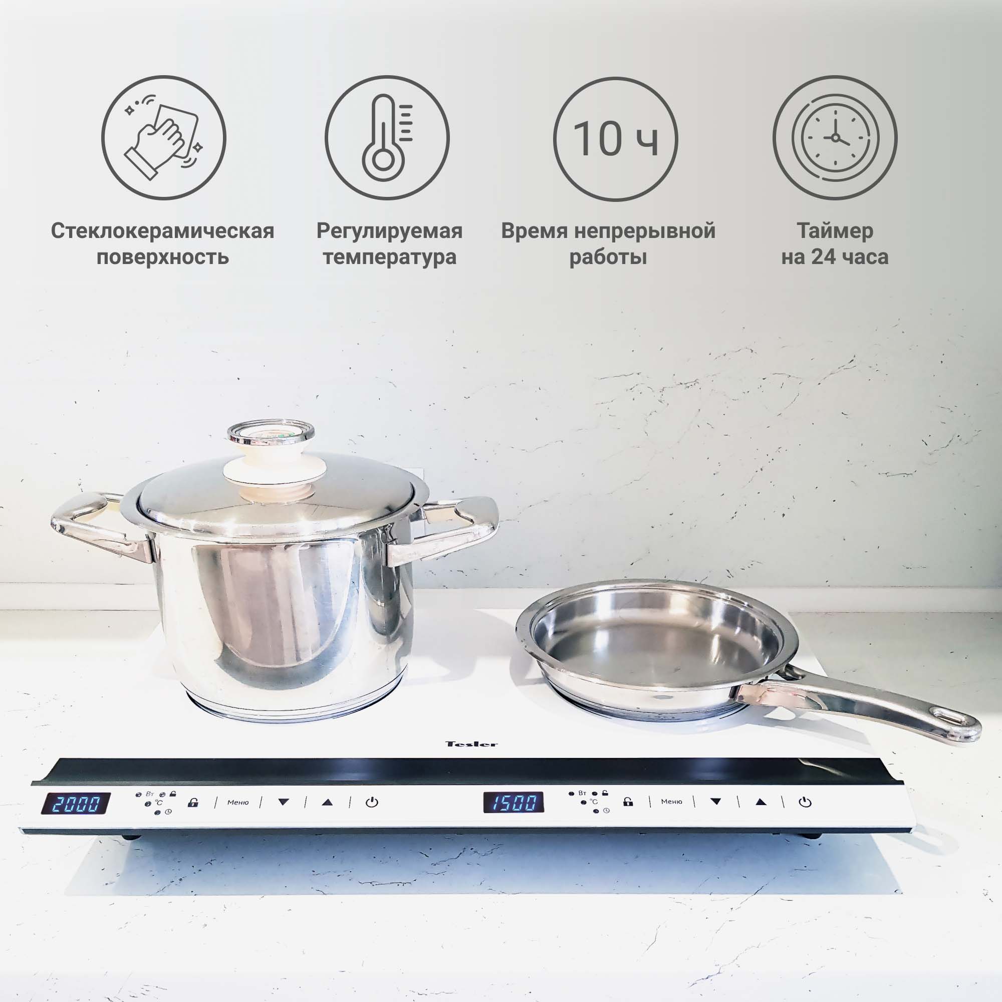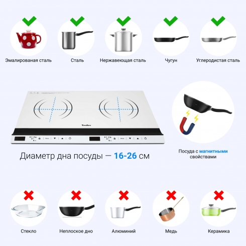 Настольная индукционная плита TESLER PI-26 делает процесс приготовления быстрым и удобным за счёт применения двух конфорок с разными уровнями мощности. Стеклокерамическая поверхность устойчива к ударам – в том числе возникающим при падении посуды или крышек, а также легко очищается от жира, копоти и других кухонных загрязнителей. Белый цвет плиты элегантно выделит её на кухне. Сенсорная панель управления с двумя цифровыми дисплеями позволяет быстро выбирать оптимальный уровень мощности и температуры.