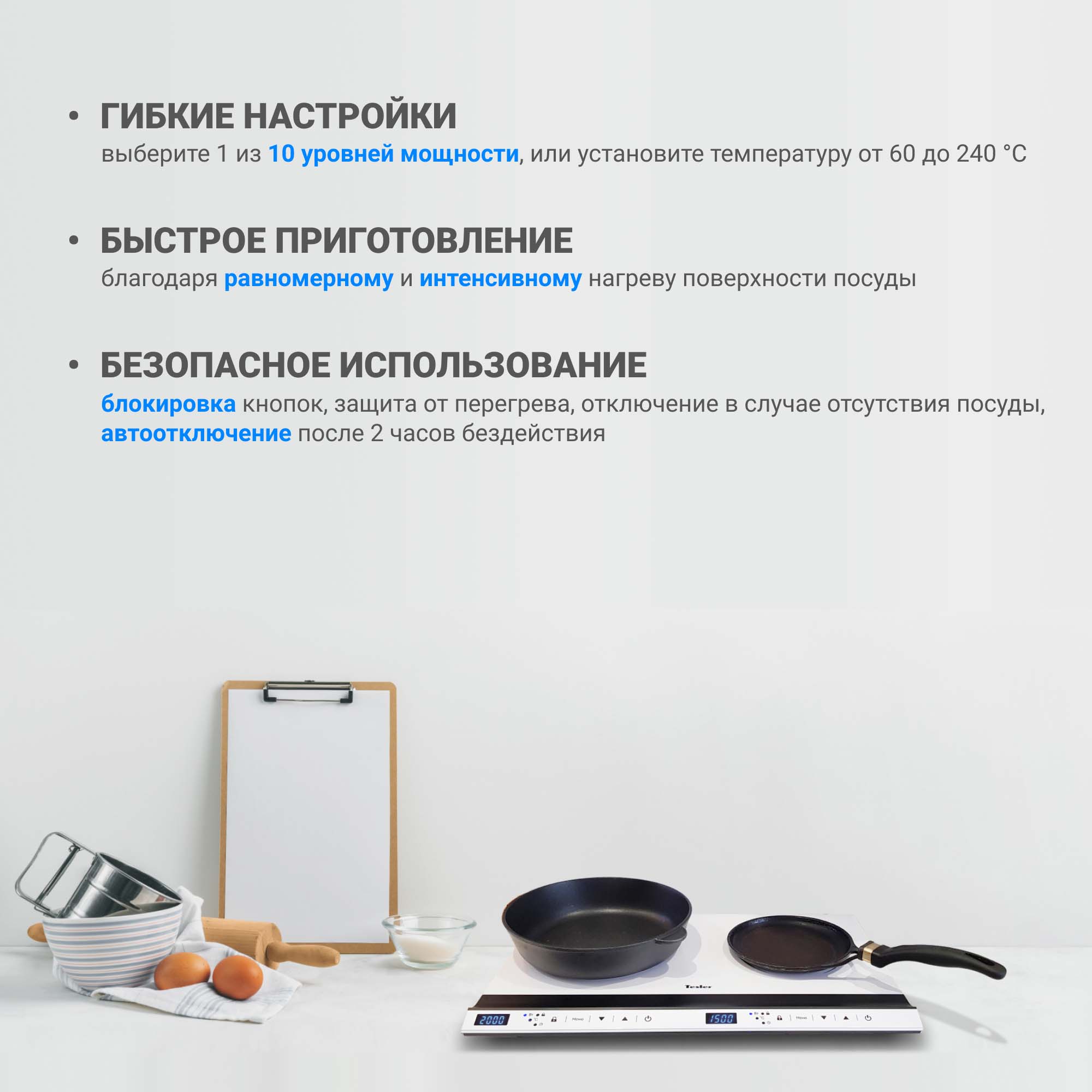 При использовании индукционной технологии нагревается не конфорка, а сама посуда, стоящая на ней, поэтому вероятность того, что владелец обожжётся о поверхность плиты, сведена к минимуму. Для большей безопасности предусмотрены блокировка кнопок от случайного нажатия, защита от перегрева и отключение в случае отсутствия посуды на плите.