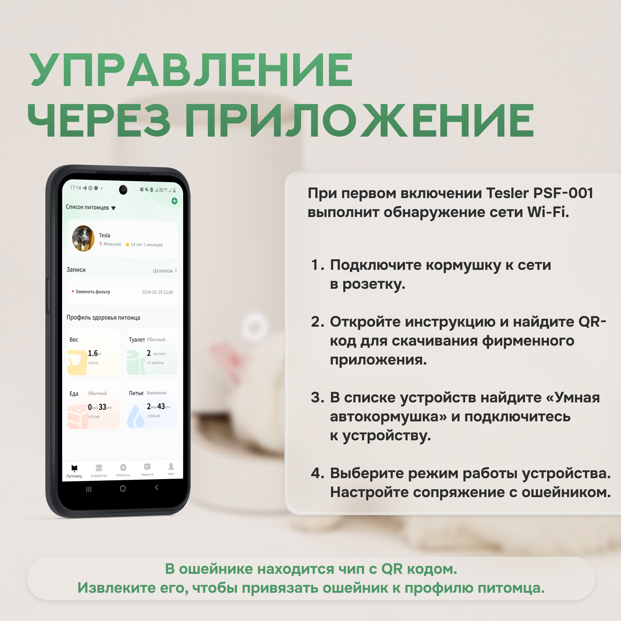 Автокормушка для животных Tesler PSF-001 позаботится о ваших питомцах, обеспечивая их регулярное и сбалансированное питание.