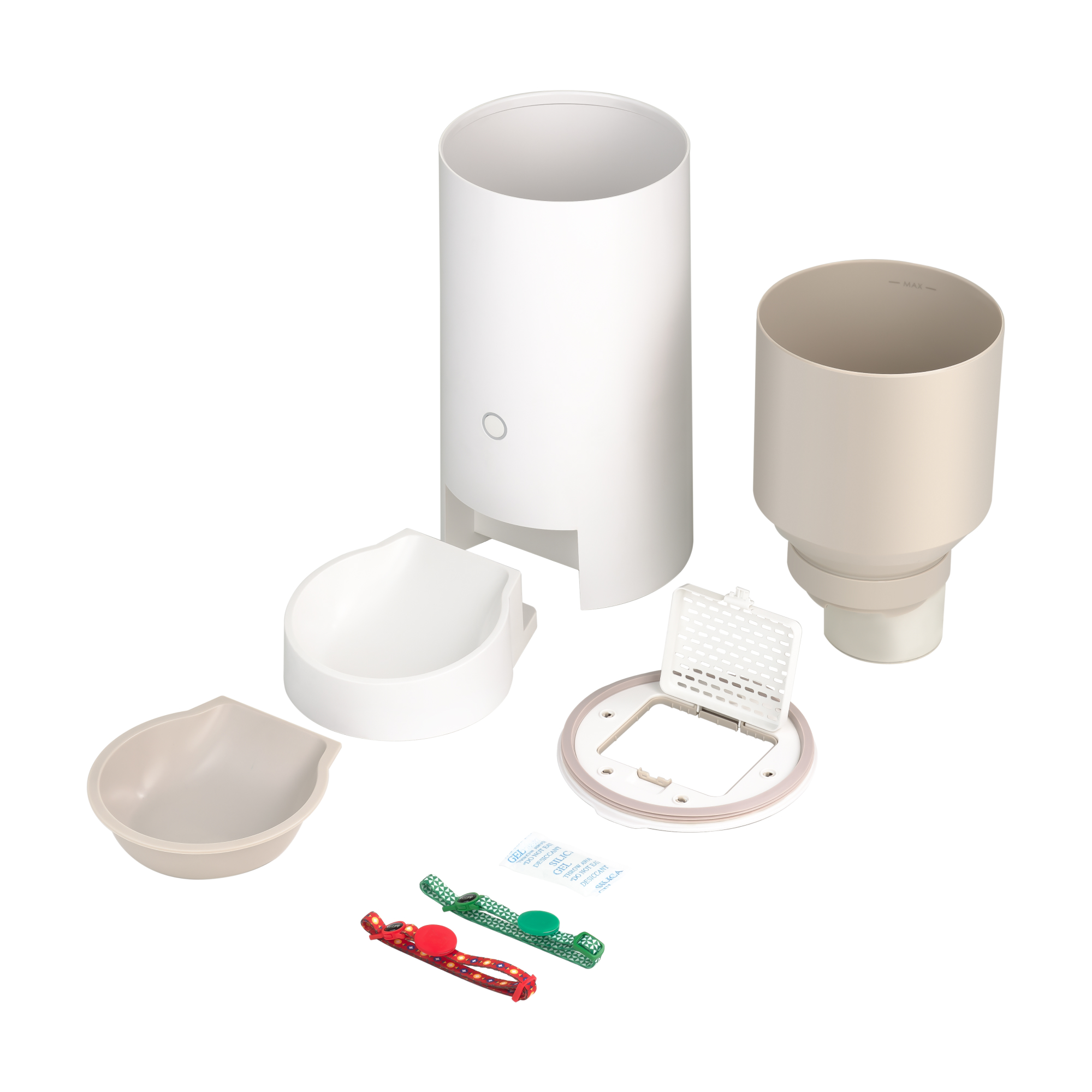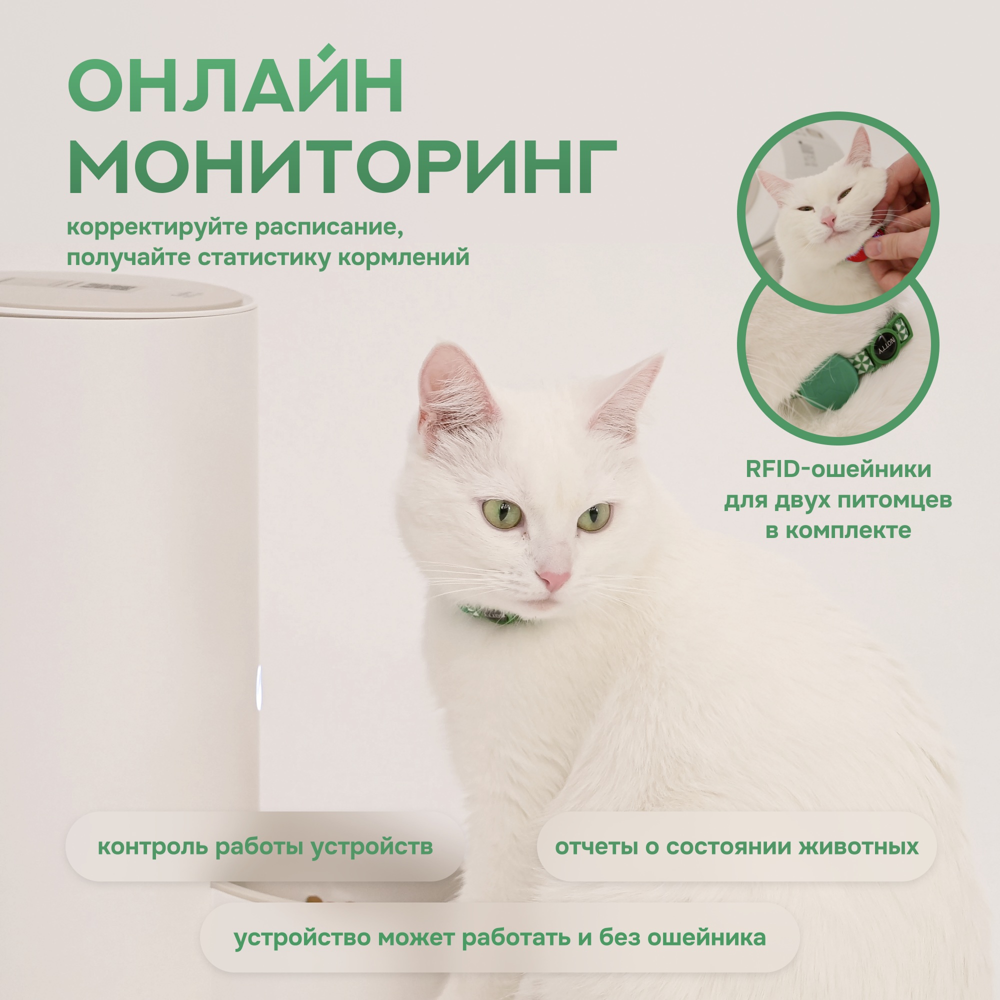 С помощью приложения для смартфона вы сможете контролировать процесс кормления, что позволит вам всегда быть в курсе происходящего, и своевременно реагировать на любые изменения. В комплект входят два ошейника с RFID-датчиками. Благодаря им в приложение придёт уведомление о приёме пищи, когда питомец приблизится к кормушке. Настройте размер порций и установите подходящий график кормления. Приложение отправляет push-уведомления о каждой порции, а также предупреждает о том, что корм в резервуаре заканчивается.