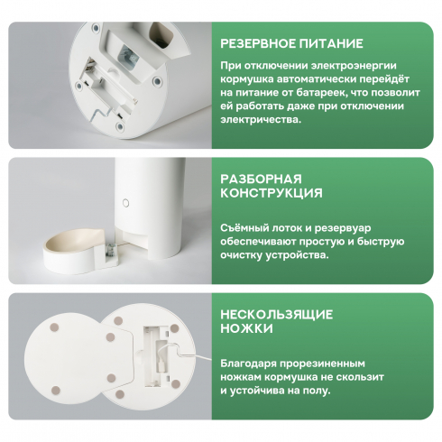 В случае отключения электроэнергии произойдет автоматический переход на питание от батарей, что позволит продолжать кормление даже при отключении электричества.