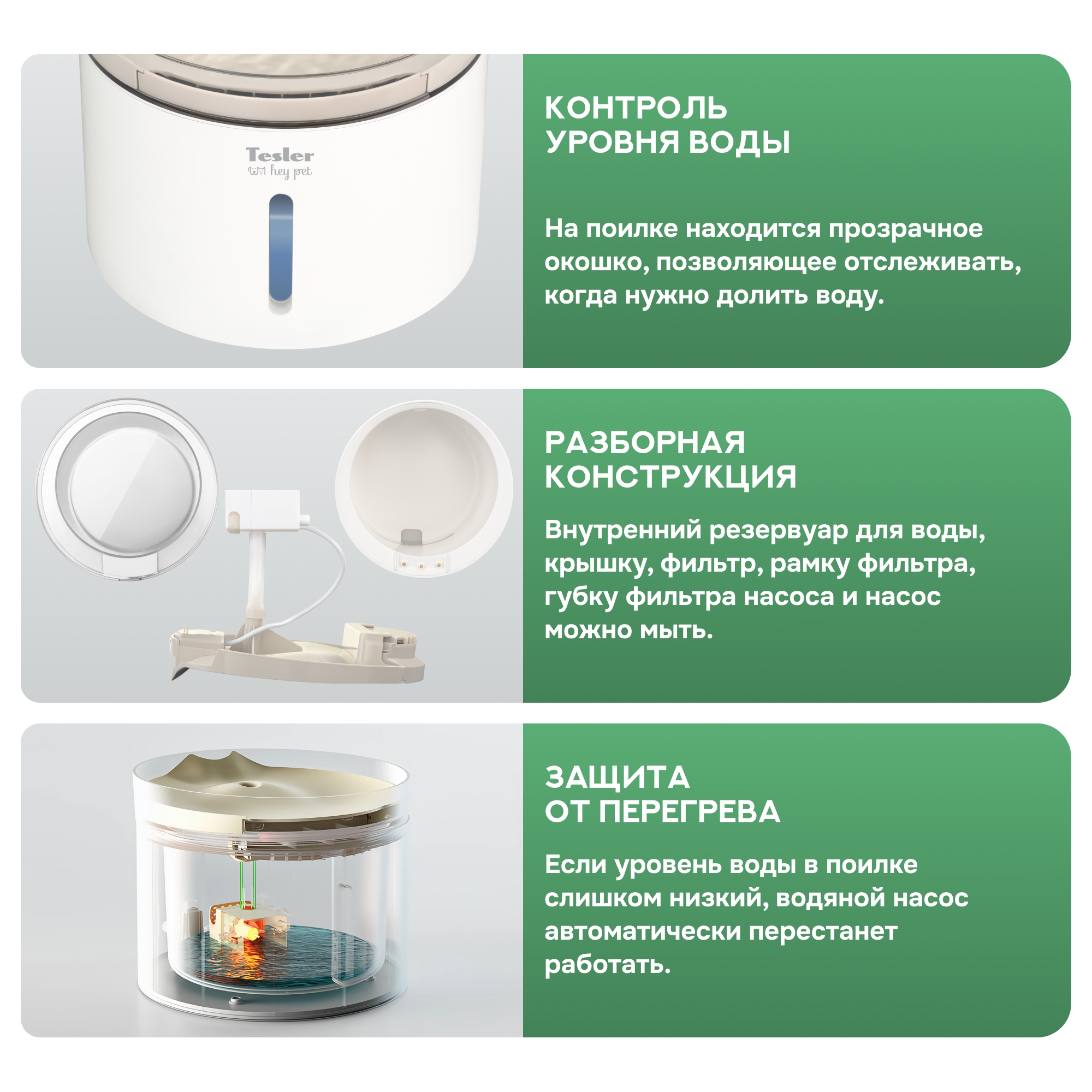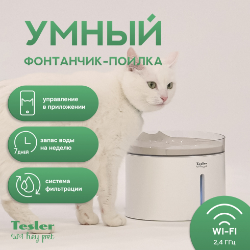 Линейка товаров для животных HEY PET от Tesler – это современные решения для заботы о домашних любимцах. Помимо автоматического фонтанчика-поилки Tesler PSW-001, вы можете дополнительно приобрести диспенсер сухого корма Tesler PSF-001 и автоматический туалет для кошек PST-001.