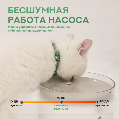 Отслеживать работу прибора можно через специальное приложение для смартфона. В комплекте идут два ошейника с датчиками, которые позволят контролировать процесс потребления воды питомцами на расстоянии. Устройство разработано для подключения к домашнему Wi-Fi на частоте 2,4 ГГц.
