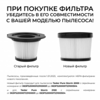При покупке фильтра убедитесь в его совместимости с вашей моделью пылесоса! Устройства, произведенные после 1.01.2023, комплектуются HEPA-фильтрами нового поколения. Для моделей Pure Storm 2000 с серийными номерами в диапазоне от 063PS20000123100001 до 063PS20000723100504 приобретайте фильтр со штрихкодом 4687204657085