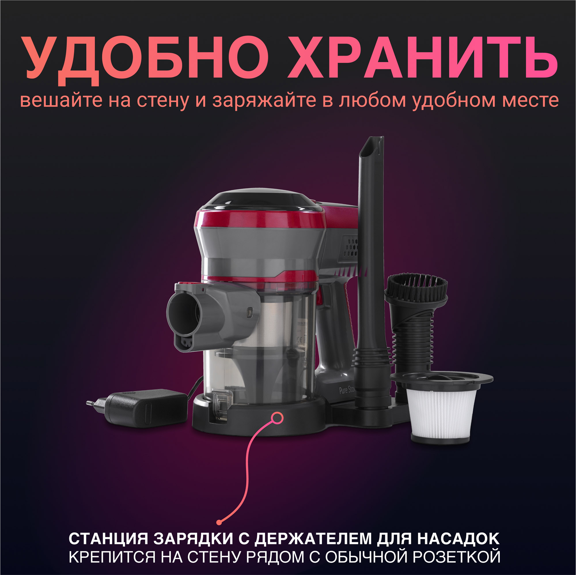 • Pure Storm - беспроводные вертикальные пылесосы 2 в 1 без мешка для сбора пыли с циклонным фильтром.
