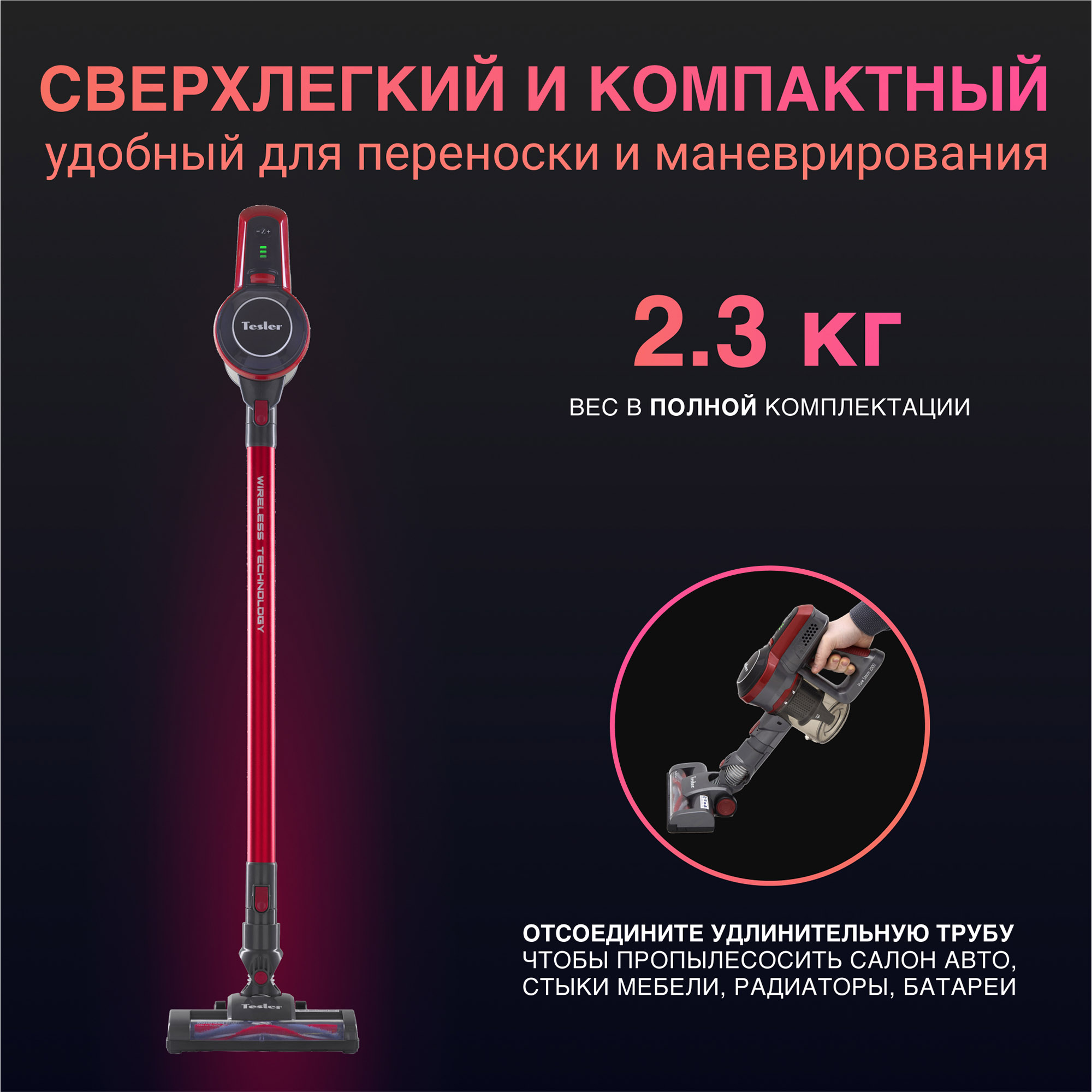 Беспроводной пылесос TESLER серии Pure Storm - это прибор 2в1. С установленной удлинительной трубой вы можете убираться на полу, а сняв её и сменив насадку, можно пропылесосить мебель, труднодоступные места или же убраться в своем автомобиле.