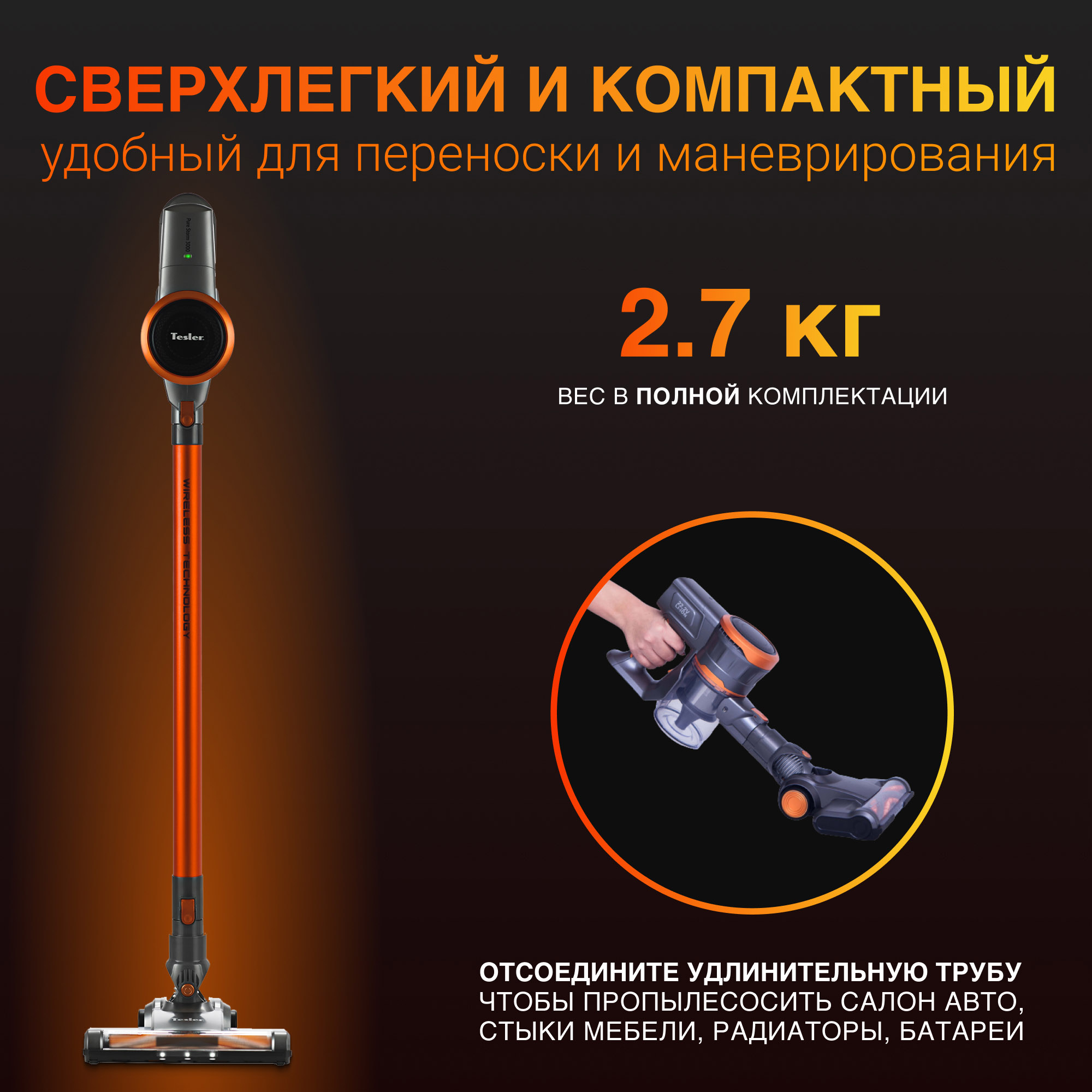 Беспроводной пылесос TESLER серии Pure Storm - это прибор 2в1. С установленной удлинительной трубой вы можете убираться на полу, а сняв её и сменив насадку, можно пропылесосить мебель, труднодоступные места или же убраться в своем автомобиле.